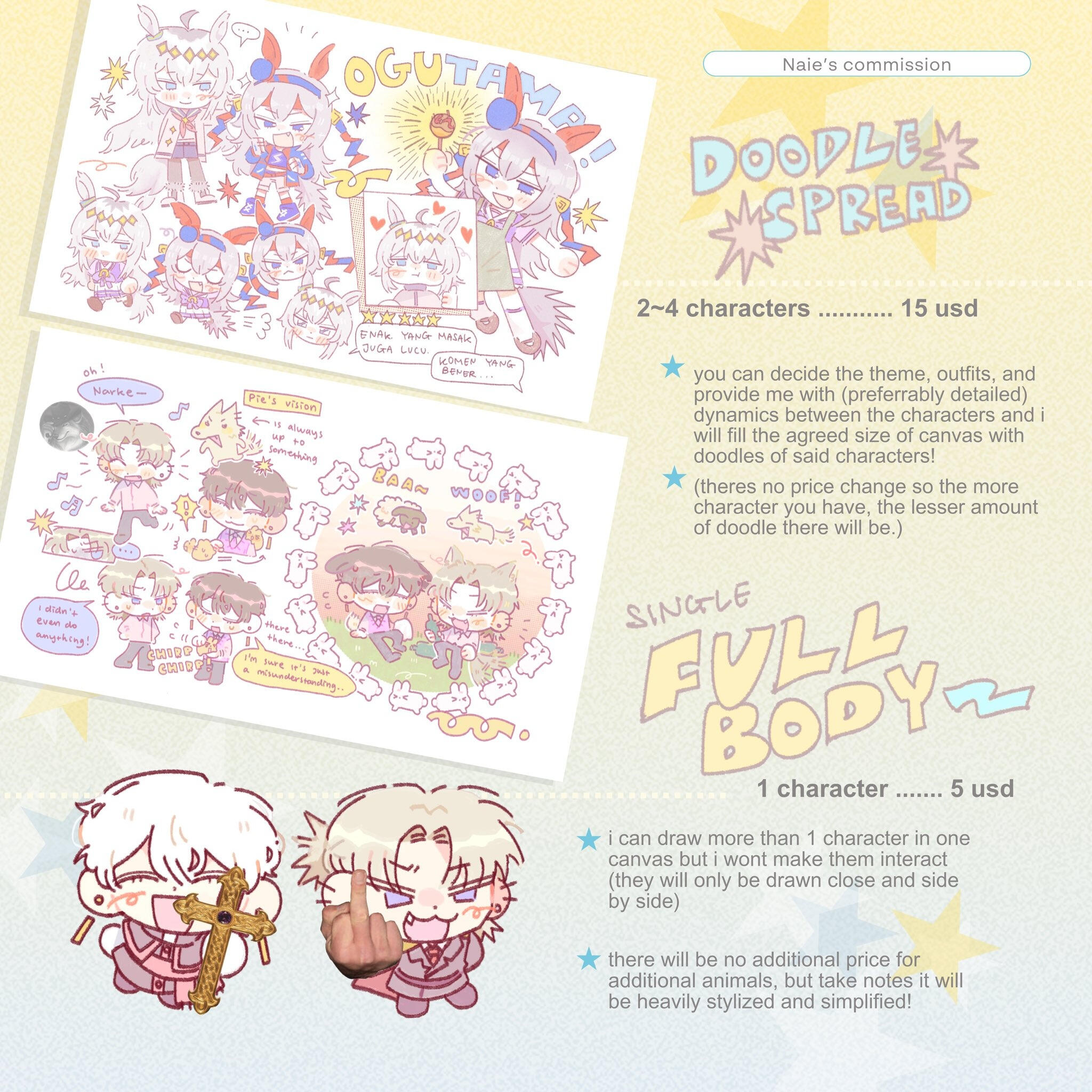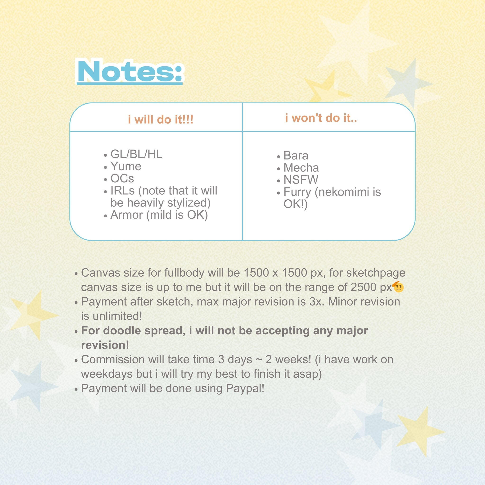 my commission is mostly for additional allowance for daily necessities that is not urgent, hence i won't be rushing to finish the comms in span of <2 days, please do let me know if you want things to be done faster! 🙇💦